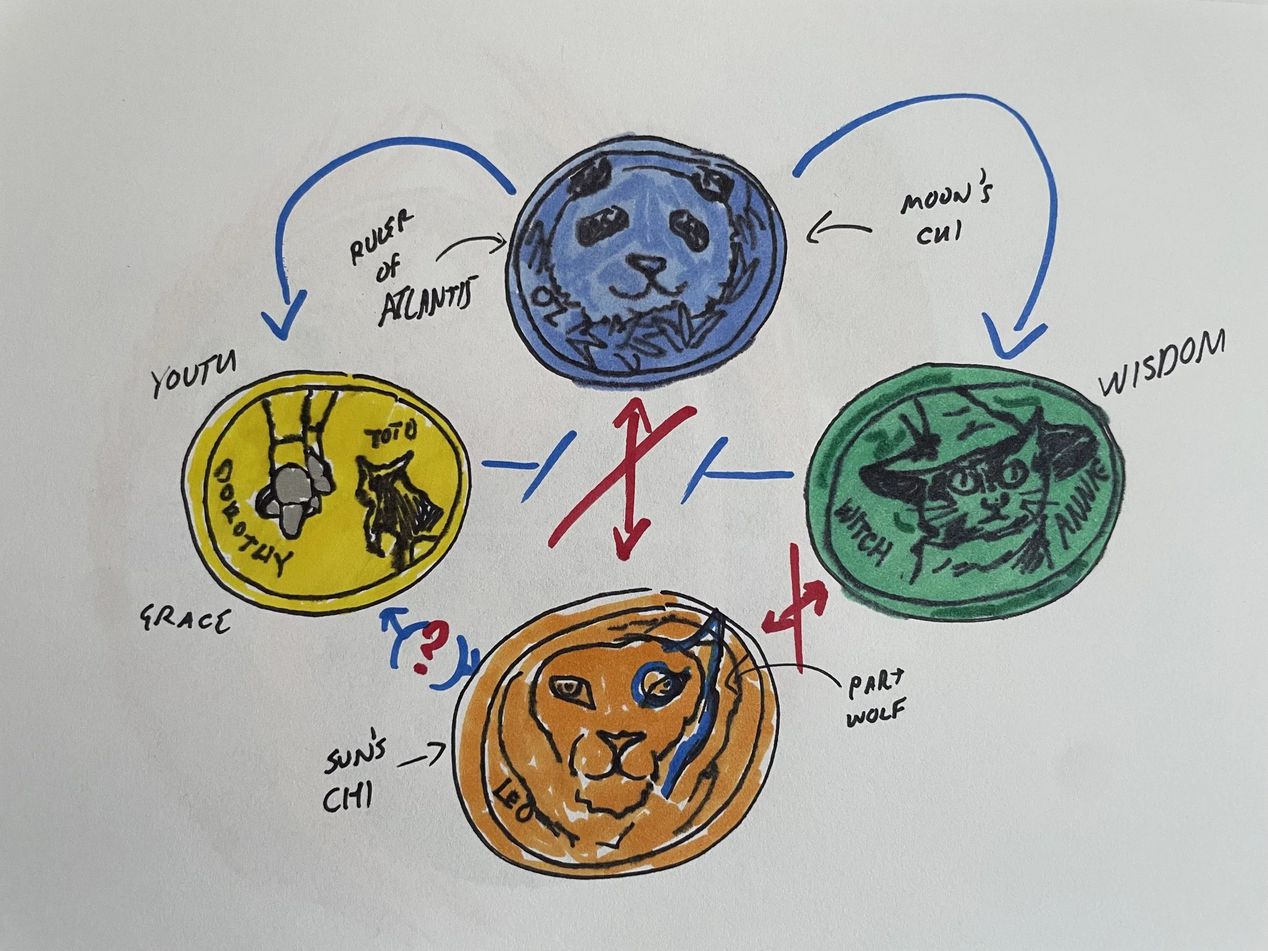 The album is not limited to just the duality between Ozwelda and DREAM, it features the duality between Annie the Bombay witch, and Dorothy and her dog, Toto. Annie is a black cat that represents wisdom, draped in the colors of green and black. There is reverence between Ozwelda and Annie, both hold great wisdom and determination. Annie is a great general under the ruler of the emerald Atlantis. Representing youth and bliss—yet elegant—Dorothy wears a sky blue and creamy white school dress. Admiration exists between Ozwelda and Dorothy, both who seek to cultivate feng shui throughout the land.