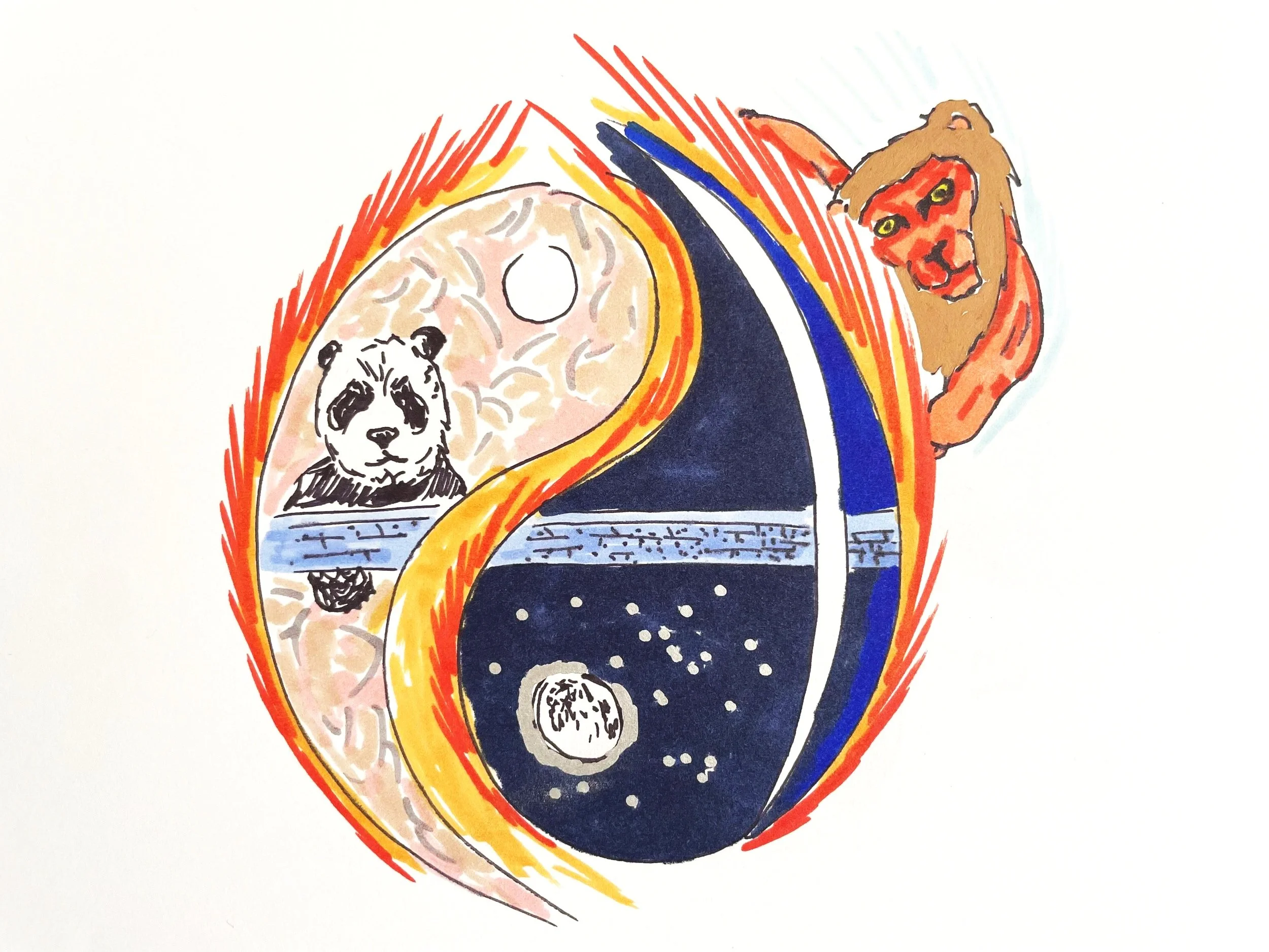 There are two main characters in this album, a panda named Ozwelda, who is the ruler of Atlantis, and a lion named DREAM. To reveal; what the panda represents is foundation, and the lion—passion, energy. The panda's black-and-white coloring mirrors the colors of the yin and the yang, creating a visual correlation between the animal and the symbol. The panda’s colors are a duality between darkness and light, space and matter, which are inherently the foundation of the universe. The lion; colors of the sun that provides energy to the earth, symbolizes passion and love. They are needed to produce life and purpose. Yet, purpose alone has no foundation, just as foundation alone, has no purpose. To exhibit progress, both must exist in harmony.